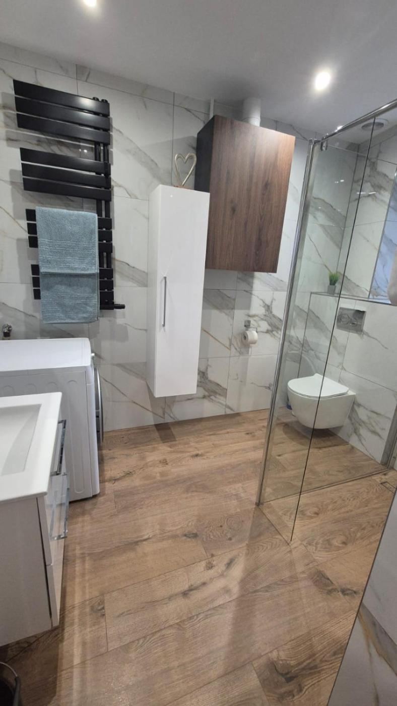 Apartament dwuosobowy typu Studio Deluxe. The studio offers a tiled floor, heating, as well as a private bathroom featuring a shower and a hairdryer. Guests can make meals in the kitchen that is equipped with a stovetop, a refrigerator, a dishwasher and kitchenware. The studio provides a washing machine, a tea and coffee maker, a wardrobe, tumble dryer, as well as a flat-screen TV with streaming services. The unit offers 1 bed. Studio - 2 osobowy. Powierzchnia pokoju ok.: 25 mkw.
