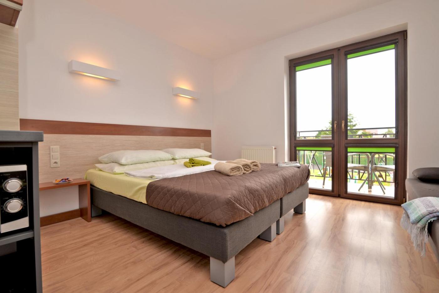 Pokój Trzyosobowy typu Standard. In the well-fitted kitchenette, guests will find a stovetop, a refrigerator, kitchenware and a microwave. This triple room features a private bathroom, a wardrobe, an electric kettle as well as an outdoor dining area. The unit offers 2 beds. Pokój Trzyosobowy - 3 osobowy. Powierzchnia pokoju ok.: 18 mkw.