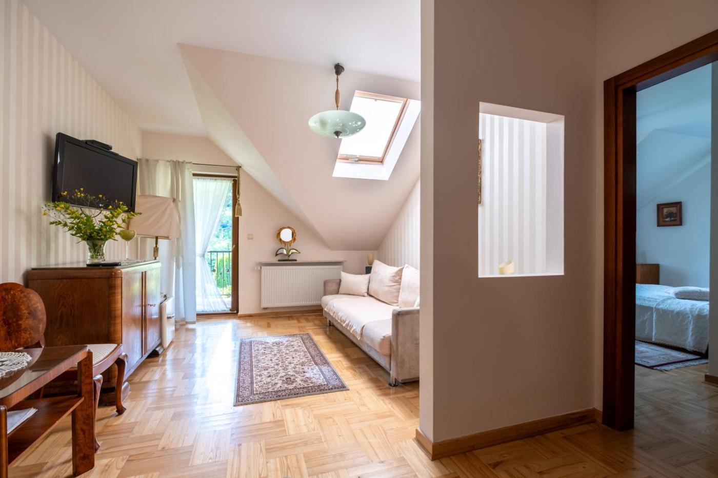 Apartament. Guests will have a special experience as the apartment offers a sauna. This apartment consists of 1 living room, 1 separate bedroom and 1 bathroom with a shower and free toiletries. Guests will find a refrigerator, kitchenware and a tea and coffee maker in the kitchenette. The apartment also offers a barbecue. Featuring a terrace with mountain views, this apartment also provides soundproof walls and a flat-screen TV. The unit offers 2 beds. Apartament - 4 osobowy. Powierzchnia pokoju ok.: 32 mkw. ;